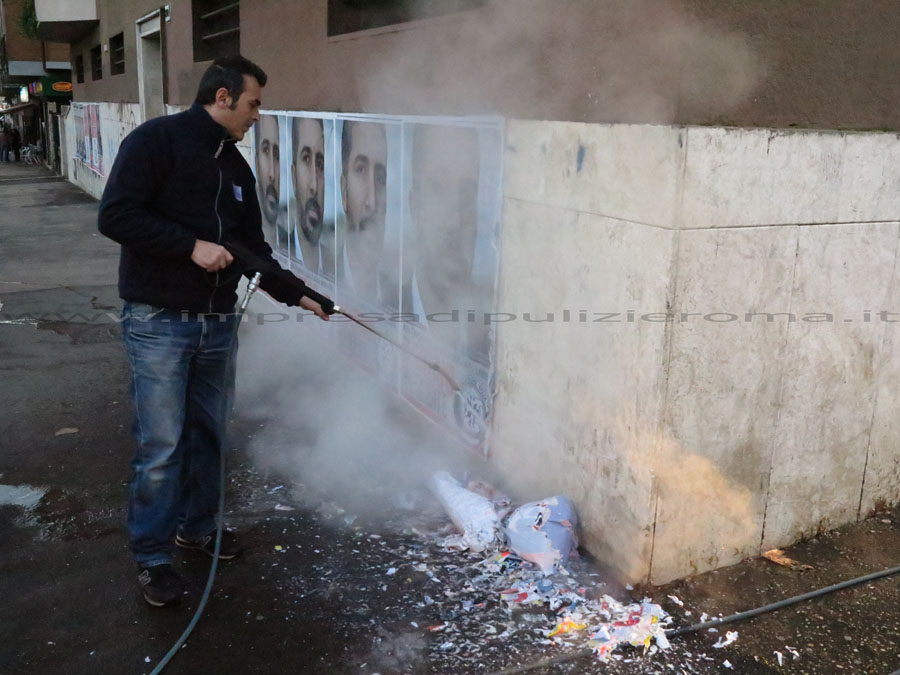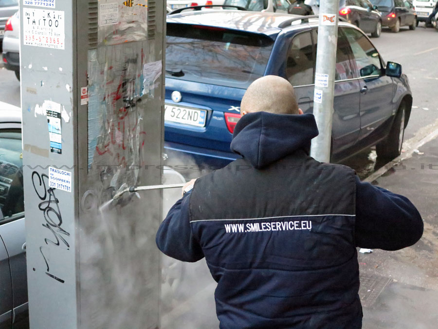 Impresa di pulizie Roma Smile Service esegue la rimozione di manifesti e adesivi da muri, pali, porte e qualsiasi superficie in genere utilizzando un mezzo speciale mobile che permette di lavorare con l’acqua a temperatura ed in pressione, in questo modo la rimozione sarà facile ed ecologica.